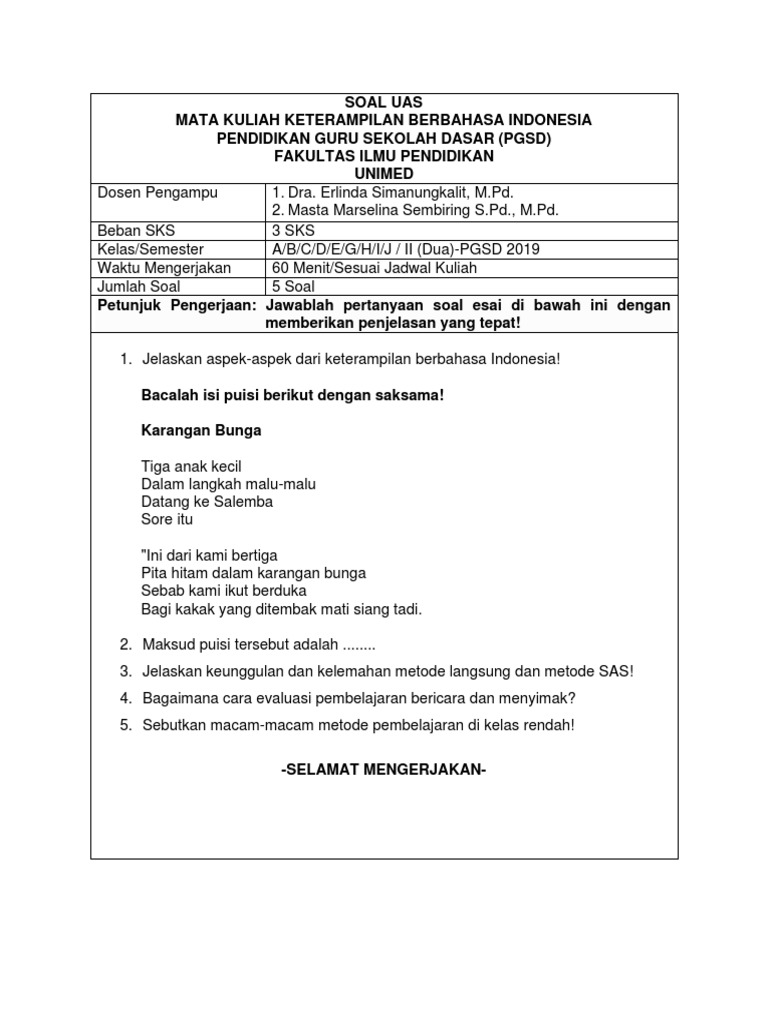 Kali ini soal yang diberikan adalah soal latihan mandiri pengajaran keterampilan berbahasa pbin4218 universitas terbuka. Pengertian pembelajaran membaca di sd. Soal pengajaran keterampilan berbahasa beserta jawaban. Soal ujian ut pgsd pdgk4101 keterampilan berbahasa indonesia soal ujian ut ini juga kami sajikan dalam bentuk file dokumen (.doc) yang mana bisa anda unduh atau download pada akhir soal. Siswa dapat menulis dengan cara menjiplak dengan baik dan benar. Kosakata sederhana dipelajari dalam suatu konteks. Keterampilan berbahasa bahasa adalah suatu sistem dari lambang bunyi arbiter (tidak ada hubungan antara lambang bunyi dengan bedanya) yang dihasilkan oleh alat ucap manusia dan dipakai oleh masyarakat untuk berkomunikasi, kerja sama, dan identifikasi diri. Manfaat pengajaran keterampilan berbahasa untuk melatih kemampuan mengungkapkan perasaan terlihat dari contoh. Menurut heilman (1977), membaca adalah interaksi dengan bahasa yang sudah dialihkodekan dalam tulisan. Jika pertanyaan (2) dan (3) benar d. Keterpaduan ini selain menarik juga. Teori tes pragmatik menekankan pembentukan kompetensi berbahasa, kemampuan berbahasa dalam fungsi komunikatif secara wajar. Poin pengajaran ditentukan oleh adanya analisis antara b1 dan b2.