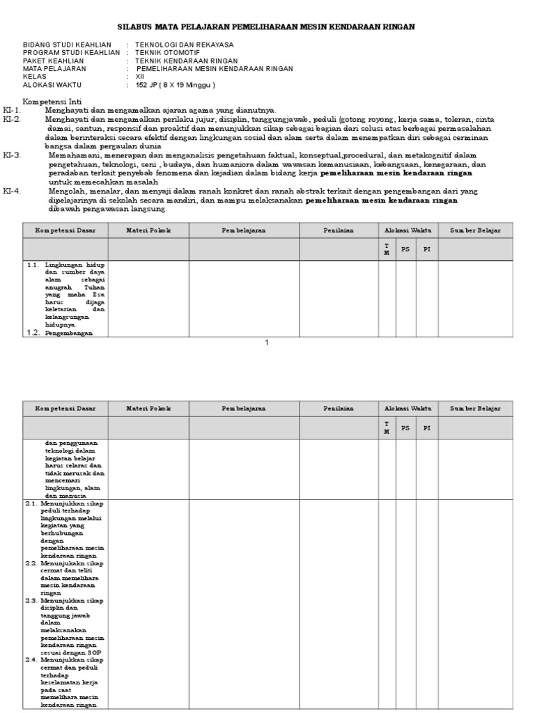 Merawat berkala sistem pelumasan (oleh : Sesuai dengan judul pada postingan di atas maka pada kesempatan kali ini saya akan membagikan perangkat pembelajaran silabus untuk mata pelajaran prakarya kelas xi sma kurikulum 2013. Download contoh silabus dan rpp smk berkarakter kelas x, xi, xii tahun 2016/2017. Soal ini merupakan kumpulan soal mesin otomotif atau pemeliharaan mesin kendaraan ringan pmkr. Silabus dan rpp ktsp smk penjaskes. Materi power point pemeliharaan mesin kendaraan ringan kelas xii. 3.2 menerapkan cara perawatan sistem pelumasan ; Tentunya jika anda adalah seorang guru maka anda mengetahui tentang perangkat pembelajaran. Menampilkan kinerja di bawah bimbingan dengan mutu dan kuantitas yang terukur sesuai dengan standar kompetensi kerja. Rpp revisi 2017 teknologi dasar. Silabus smk otomotif kelas x,xi,xii tahun 2018 akan kami bagikan dalam postingan kali ini. Menghayati dan mengamalkan ajaran agama yang dianutnya. Hal itu berlaku juga bagi guru smk yang mengampu mata diklat teknik otomotif.