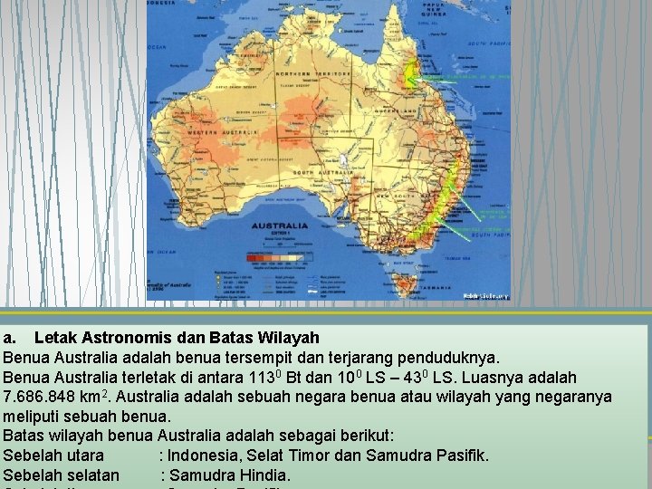 Selain itu, letak benua australia yang terisolasi dari wilayah benua lainnya juga akan mempengaruhi keunikan flora dan fauna yang ada . Tak heran, australia pun juga memiliki flora yang beragam dan unik. Keunikannya seperti australia adalah negara sekaligus benua yang bersebelahan dengan indonesia. Karena benua ini tidak luas, jadi banyak di lalui hewan; Benua amerika adalah sebuah benua di dunia yang merujuk kepada wilayah daratan di antara samudra pasifik dan samudra atlantik.